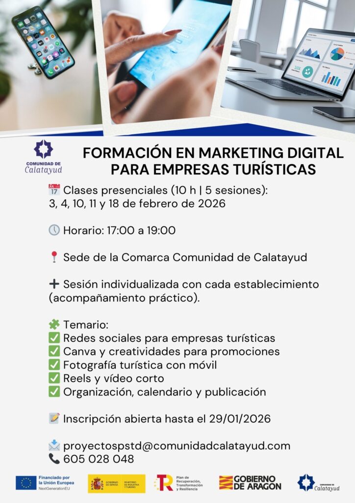 El Plan de Sostenibilidad Turística en Destino (PSTD) de la Comarca Comunidad de Calatayud inicia sus acciones de 2026 con el curso “Formación en Marketing Digital para empresas turísticas”. Esta propuesta ofrece a los negocios vinculados al turismo (alojamientos, restaurantes, bodegas, empresas de actividades…) cinco sesiones grupales sobre el uso de las redes sociales para atraer visitantes y una de acompañamiento práctico individual para cada participante.